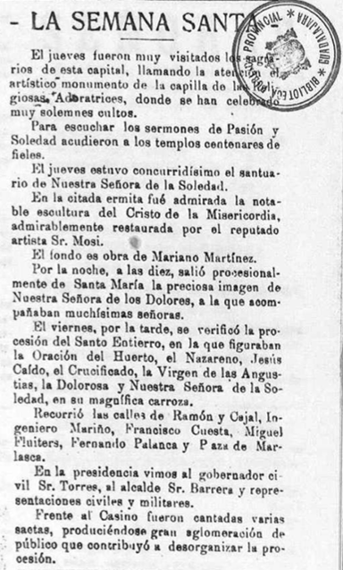 Según este testimonio, el Jueves Santo salió procesionalmente desde la parroquia de Santa María la preciosa imagen de Nuestra Señora de los Dolores, acompañada por “muchísimas señoras”, lo que pone de manifiesto la profunda devoción popular y, especialmente, la destacada participación femenina en torno a la Virgen ya en aquella época.